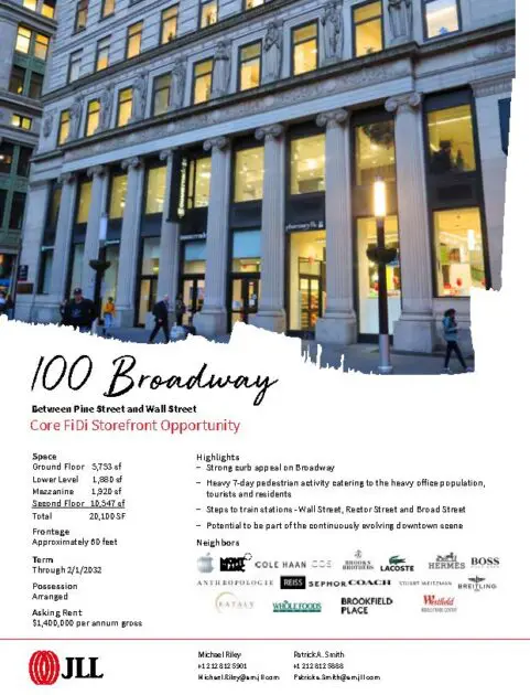 その昔オランダ人入植者らの領地を守るために作られた壁の跡地である,ウォール・ストリート。近代史に何度なくその名が刻まれており,言わずと知れた世界の金融センターです。このウォール・ストリートとブロードウェイに面した1897年に建てられた24階建ての歴史あるオフィスビル。1998年にリノベートされています。このビルの2階の10,547s.f.(979.85㎡)のサブリース物件。1s.f.あたりの賃料は$2.08で,1ヶ月$21,937(約230万円)です。