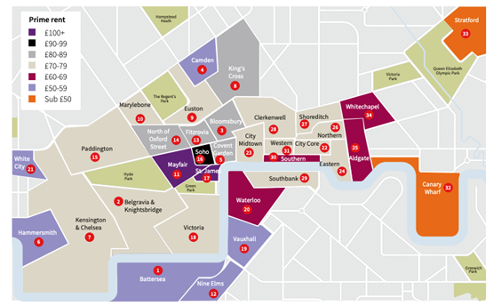 ロンドンにおけるオフィス賃貸料は、ウェストエンドが最も高額で、次いでシティ、イーストエンドの順となっています。テムズ川南岸のサウスバンクはおおむねシティと同水準、新たなシティと期待されているウォーターフロントのエリア・カナリーワーフはイーストエンドよりも安価となっています。